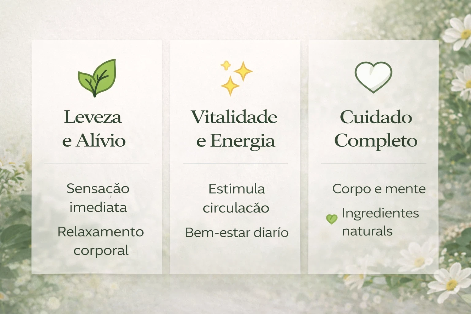 - O uso contínuo contribui para leveza, relaxamento e bem-estar corporal